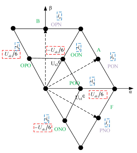 Because each phase of the T-type three-level inverter can output three states—P, O, and N—the three phases together yield 27 switching states, corresponding to 27 basic space voltage vectors. As shown in Figure 2, the space voltage vector diagram can be divided into six major sectors (A, B, C, D, E, and F) based on the angle in the α–β plane. In Figure 2, the 27 basic space voltage vectors are divided into four categories based on their magnitudes: large, medium, small, and zero vectors. The large vectors have a voltage magnitude of 2Udc/3, the medium vectors have a magnitude of Udc/3, the small vectors have a magnitude of Udc/3, and the zero vectors have a magnitude of 0. Each vector type affects the neutral-point voltage differently, and the corresponding neutral-point current for each vector can be determined using the following formula: