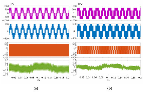 m = 0.8 (a): UAB line voltage of VSVPWM, UA phase voltage, UCMV common-mode voltage, UCN capacitance difference (b): UAB line voltage of hybrid variable VSVPWM, UA phase voltage, UCMV common-mode voltage, UCN capacitance difference.
