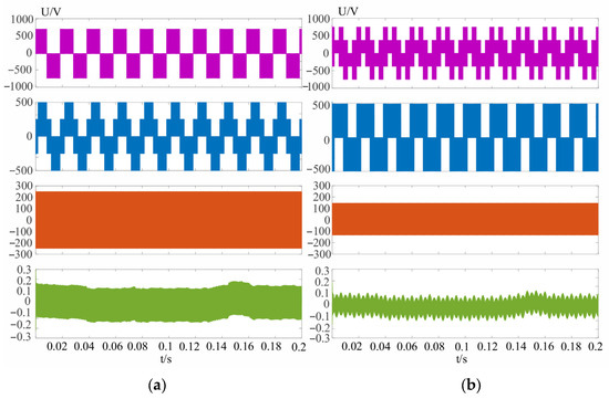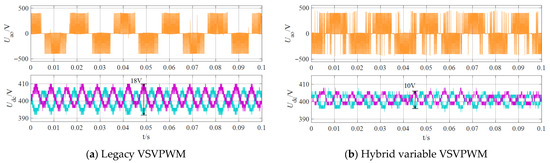 According to the steady-state experimental results in Figure 7 and Figure 8, the traditional VSVPWM shows a very small voltage difference between the upper and lower capacitors (around 0.2 V), and the CMV ranges from approximately ±250 v (). In contrast, the hybrid variable VSVPWM exhibits an even smaller capacitor voltage difference (around 0.1 V), with the CMV limited to about ±125 v (). Thus, while both VSVPWM methods can control the neutral-point voltage, the CMV generated by the hybrid variable VSVPWM is only half that of the traditional VSVPWM. As analyzed earlier, the fundamental vectors chosen in traditional VSVPWM have higher CMV values compared to those selected in the hybrid variable method, resulting in greater CMV in the synthesized vectors. Overall, the advantages of the hybrid variable VSVPWM over the traditional VSVPWM are much more pronounced.