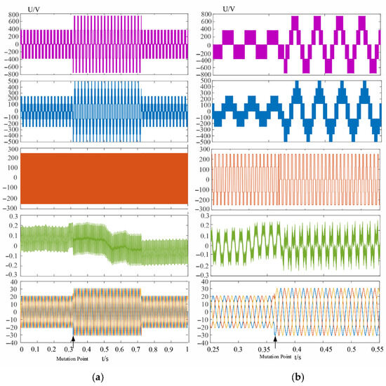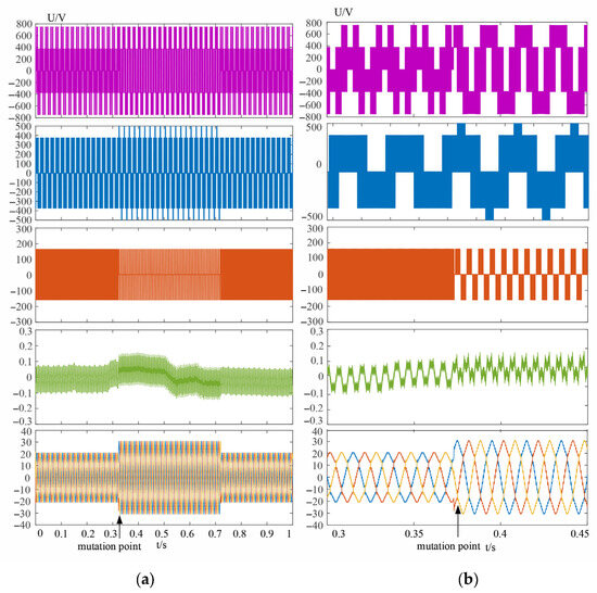 m = 0.3 to 0.6 (a): UAB line voltage of VSVPWM, UA phase voltage, UCMV common-mode voltage, UCN capacitance difference, iABC three-phase current dynamic diagram (b): Mutation part.