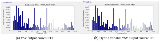 According to the dynamic experimental results shown in Figure 9 and Figure 10, when the modulation index m changes abruptly, the hybrid variable VSVPWM exhibits lower AC ripple and a smaller DC offset in the neutral-point voltage. Overall, its control performance is superior to that of the traditional VSVPWM. In Figure 11, under a 50% unbalanced load condition and with the DC bus voltage set at 800 V, the output voltage of the energy storage inverter and the fluctuations of the bus capacitors are presented. It can be observed that the proposed hybrid variable VSVPWM maintains a capacitor voltage difference within ±5 V under different modulation indices, which is a marked improvement over the traditional VSVPWM under unbalanced load conditions. This validates the adaptability of the proposed algorithm. Furthermore, Figure 12 displays the FFT analysis spectra of the current for both methods under identical hardware conditions. The comparison indicates that, while the proposed hybrid virtual vector algorithm effectively provides neutral-point balancing and common-mode voltage suppression, it has a minimal impact on the output harmonics.