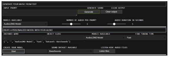 We developed the interface following the AI controllability principles outlined in [58]. For the scope of this study, we prioritized the principle related to designing for exploration by integrating multiple outputs and controls [58]. The ability to generate multiple outputs allows users to explore different possibilities and better understand the model’s range of capabilities. Providing controls enables interactive engagement, allowing users to navigate the space of possible outputs for a given input. For this aspect, we emphasized human control by implementing both generic controls, applicable across different generative technologies, and domain-specific controls [4], especially in the case of the personalization technique for the generative audio model. This approach allows for greater flexibility in adapting the model’s responses to specific user preferences and requirements. For generic controls, we took inspiration from models available through platforms like Hugging Face https://huggingface.co/spaces/facebook/MusicGen (accessed on 21 August 2025), https://huggingface.co/spaces/haoheliu/audioldm2-text2audio-text2music (accessed on 21 August 2025), ensuring that users have familiar and intuitive control options similar to those found in these interfaces.