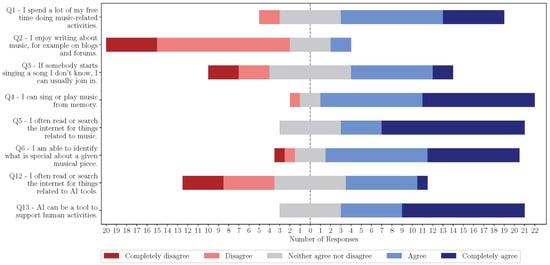 The first part of the experiment focused on understanding the relationship of participants with AI tools and music in general. To gather this insight, participants were asked to complete a questionnaire. Figure 3 presents a subset of questions rated on a five-point Likert scale, visualized using a diverging bar chart. The chart illustrates the number of respondents for each answer, with positive responses on the right and negative responses on the left, centered around the midpoint. Neutral answers are split between positive and negative categories. The length of each bar represents the number of responses for each score, allowing easy comparison of the distribution. Each color indicates the group of responses corresponding to a specific score. Additional details on other responses are provided in the text.