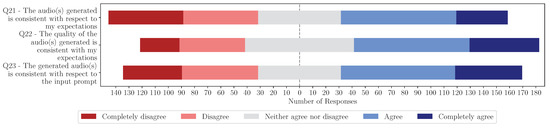 Each participant was asked to complete the survey Model Evaluation Survey after each interaction with the model. Each audio(s) generation corresponds to one interaction with the model. Figure 4 reports the answers for all the different interactions of all participants. The survey focused on understanding participants’ perceptions related to three aspects: the consistency between the generated audio files and input prompts, the consistency between the generated audio samples and user expectations, and the overall quality of the audio(s) output concerning the user expectations. Only a limited number of the participants considered the overall generation to be entirely aligned with their expectations, both in terms of content and quality. The same holds for the consistency between audio and input prompts. The majority of participants rated all three aspects between 3 and 4 (on a Likert scale from 1 to 5), suggesting that they perceived the generated audio to align reasonably well with their expectations and the input prompts provided. However, it is important to acknowledge that the subjective nature of the expectation scale presents a limitation in this study. We did not collect pre-generated user expectation data, but we intend to address this in future experimental designs.