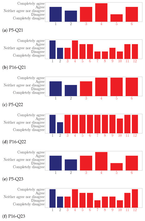 Answers of P5 (a,c,e) and P16 (b,d,f) to the questions Q21, Q22, and Q23 of the Model Evaluation Survey, for each single interaction with the model. The red color indicates that at the specific iteration, the user personalized the model, the blue one, that personalization was not used.