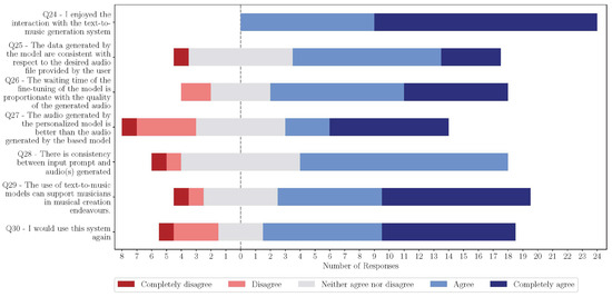 In Figure 6, we present responses to Likert scale questions related to the final questionnaire. Q24 shows unanimous agreement on enjoying the interaction with the system, reflecting strong user engagement. However, Q28 highlights a key challenge for current TTM models, as no participants completely agreed on the consistency between the input prompt and the audio generated. Interestingly, as Q26 shows, none of the participants completely disagree that the fine-tuning waiting time is proportionate to the output quality. In Q31, we asked if they would include this workflow in their music creative process and how. of participants selected I would only use it for inspiration purpose, while chose I would take the audio generated and modify it in post-generation. Other participants shared different comments. P17* asserted: “At the moment, no, because the program does not process music according to my specifications”, suggesting the need for higher controllability. P10* commented, “I would use it for specific exercises on rhythm and improvisation based on the generated audio”, which is a type of application that was not considered when we designed the questionnaire.