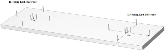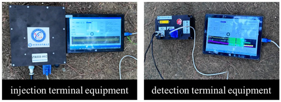 The system is composed of several key modules in the hardware design, including the signal injection unit, detection unit, electrode component, and its connecting cable. Figure 1 shows the appearance structure of the injection and detection equipment. The electrodes at the injection end are arranged in a cross arrangement, and two orthogonal injection directions are set. The extremely low-frequency current field signal is injected into the ground through two pairs of electrodes to form a stable ground electrode current field. Compared with the traditional single-electrode design, this two-electrode layout reduces the signal attenuation caused by the poor contact between the electrodes and unreasonable distance, and enhances the signal transmission intensity and uniformity. The detection end electrode adopts the ‘L’-type layout method, and two mutually vertical detection channels are set up to sensitively capture the voltage change of the underground signal. The electrode arrangement shown in Figure 4 clearly shows the relative position of the signal injection end and the signal detection end. All electrodes are buried at a depth of 0.5 m, the electrode spacing at the injection end is 25 m, and the electrode spacing at the detection end is 2 m to improve the accuracy of the voltage signal. Each electrode has a length of 1.2 m and a radius of 0.015 m to ensure a sufficient contact area [26].