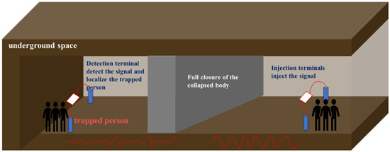The injected ground electrode current field constructs a two-electrode structure composed of an injection end and a detection end in the underground medium by applying an extremely low-frequency [25] ground electrode current field signal for signal transmission. Different from the strong attenuation of high-frequency signals in the process of underground propagation, extremely low-frequency ground electrode current field signals have a lower attenuation rate and stronger penetration ability in complex media such as soil and rock, so they can provide stable signal support in a closed environment without satellites and beacons. As shown in Figure 1, the injection module is connected to the electrode through the wire, and the control unit directs the flow of the modulated electrical signal into the ground through the electrode. The ground is used as the medium for signal transmission and is received by the remote detection device, so as to realize the long-distance transmission of the signal [15]. The transmission mechanism of the signal in the process of injection and detection is shown in Figure 2. A large number of ground electrode current field signal samples were collected through multiple rounds of tests, which provided data support for the subsequent FRFT processing, feature extraction modeling, and positioning. Figure 3 shows the deployment of the system in the underground rescue scenario: the trapped person will bury the detection electrode underground to detect the externally injected ground electrode current field signal; and external personnel use the injection device to transmit signals. After the trapped person detects the signal, combined with the feature extraction and positioning method proposed in this study, the estimation and feedback of their own position can be realized. Its overall structural design fully considers the complexity of the underground medium and the non-uniformity of the conductivity distribution, ensuring that the signal has a good penetration ability, and can penetrate various geological media such as rock strata, collapse bodies, sand, and reinforced concrete structures, thereby enhancing its adaptability and positioning stability in complex underground environments.