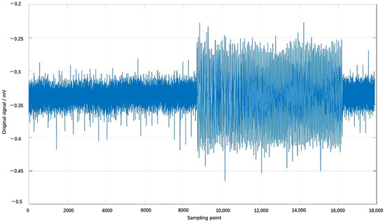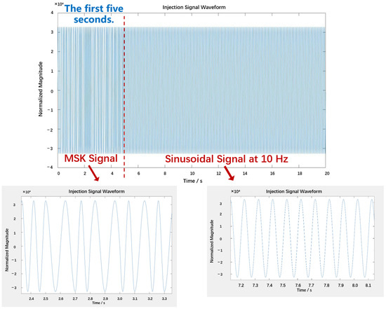 In order to enhance the signal transmission capability of the system under complex geological conditions, this study systematically improves the signal type selection, structural parameter tuning, and anti-interference mechanism. First of all, the system selects an extremely low-frequency current field signal with good underground adaptability as the injection source, which shows low attenuation characteristics in the underground medium, and can effectively resist the signal blocking effects caused by structures such as rock strata, sandy soil, and reinforced concrete. The ground current field signal with a total duration of 15 s is injected at the injection end. The first 5 s are the minimum frequency shift keying (MSK) signal for synchronous matching, and the last 10 s are the sine wave signal with a frequency of 10 Hz. The injection voltage is 100 V to ensure that the signal has sufficient propagation energy in complex underground media. The waveform of the injected signal is shown in Figure 5. Secondly, in order to adapt to the conductive characteristics of different underground media, the system dynamically configures the electrode arrangement and injection intensity according to the resistivity distribution of the target area. This mechanism effectively improves the adaptability of the current field structure in the geological non-uniform body and enhances the stability of the signal transmission link.