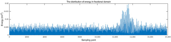 In order to achieve stable and discriminative feature extraction, the following fractional domain signal-processing flow is adopted in this paper: Firstly, the received signal is band-pass-filtered to suppress environmental interference. Secondly, the coarse step size of 0.1 and the fine step size of 0.01 are set in the range of α ∈ [0, 1], and the optimal fractional order α* of the signal is accurately searched by the two-stage scanning method, that is, the order that can maximize the energy concentration in the fractional order spectrum. Under this optimal order, the amplitude spectrum and power spectrum of the signal in the fractional domain show significant energy-focusing characteristics. The time-domain signal after filtering at the detection end is shown in Figure 7 and Figure 8, which shows the fractional-domain amplitude spectrum of the detection signal under the optimal fractional order. From the graph, it can be seen that the signal exhibits energy concentration characteristics under the optimal order. The results verify the effectiveness of FRFT in dealing with non-stationary signals and can achieve the prominent characterization of key features in the rotation domain.