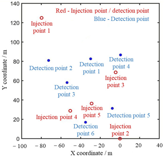 As shown in Figure 10, a total of 5 groups of injection points and 6 detection points were set up in this experiment, and 101 sets of geoelectric field response sample data were collected for the subsequent fractional domain feature extraction, distance modeling, and positioning algorithm evaluation.
