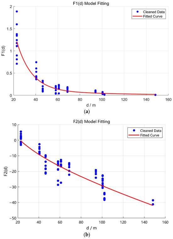In order to verify the validity of the established feature–distance model, based on the 38 sets of ground electrode current field response samples collected in the experiment, the nonlinear fitting modeling of the main peak amplitude characteristic model () and the power characteristic model () at the main peak frequency is carried out, and the scatter plot and fitting curve are drawn, as shown in Figure 11. It can be observed that there is a certain monotonic attenuation relationship between the two types of features and the distance, and there is a good fitting trend in most of the distance intervals.
