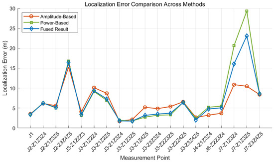 In order to further improve the positioning accuracy and stability, this paper introduces a fusion positioning strategy under the constraint of feature consistency. On the basis of obtaining the positioning results of the model and the model, the weighted least squares criterion is used for coordinate fusion, and the weight factor is adaptively set according to the error standard deviation of each model in the region, so as to realize the error suppression and credibility enhancement in the single-point positioning results. Compared with the positioning results of the single-feature model, the fusion strategy can effectively balance the complementary advantages of the two and alleviate the instability of the single feature at specific points. The fusion positioning error is shown in Figure 12, and the average error is reduced to 6.896 m, showing a higher stability and accuracy.