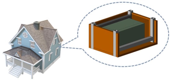 Electrical energy storage is the key solution to optimise the exploitation of renewable energy resources, as enshrined in the objectives of the European governments’ strategic initiatives aiming at the green transition and climate neutrality in the next years []. In particular, as the energy sector transitions from centralised fossil-fuel-based production to decentralised renewable generation, the ability to buffer electrical energy becomes essential for ensuring grid stability, load balancing, and energy availability in both residential and commercial sectors. At the same time, the increasing electrification and digitalisation of modern buildings have introduced new challenges related to electromagnetic compatibility (EMC). Contemporary structures are densely populated with electrical and electronic systems, making them increasingly exposed to both intentional and unintentional electromagnetic fields (EMFs). Energy-efficient buildings are especially characterised by the widespread deployment of sensors, controllers, and communication modules, which are orchestrated through software platforms forming the backbone of Internet of Things (IoT) infrastructures. These IoT systems constitute the operational intelligence of so-called smart cities, that are digitally advanced urban environments designed to optimise resource use and reduce environmental impact []. In this evolving technological context, the concept of energy-buffering structural layers (modular units that simultaneously fulfil structural, thermal, and electrical functions) emerges as a promising solution. These multifunctional components, as investigated in the present work and illustrated in Figure 1, offer a compelling solution to the integration of electrical energy storage directly within the building envelope []. By embedding energy storage elements within walls or other architectural elements, it becomes possible to reduce transmission losses, facilitate demand-side management, and support decentralised energy systems.