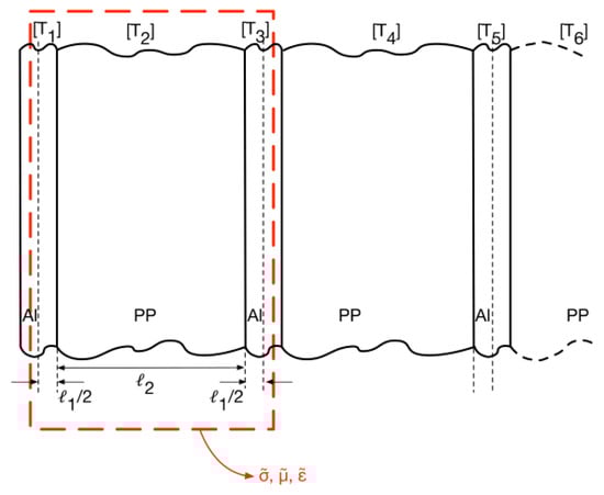 Starting from a three-layer structure of the capacitor (aluminum–polypropylene–aluminum, shown in Figure 3), in which the layer thicknesses and real physical parameters of the capacitor are considered, the transmission matrix (4) can be determined, whose elements allow the propagation constant (5) and the characteristic impedance (6) to be found. The transmission line parameters for the homogenised structure are then defined as follows: