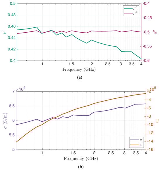 Effective parameters of the homogenised structure as a function of frequency: (a) complex magnetic permeability and (b) conductivity and electric permittivity.