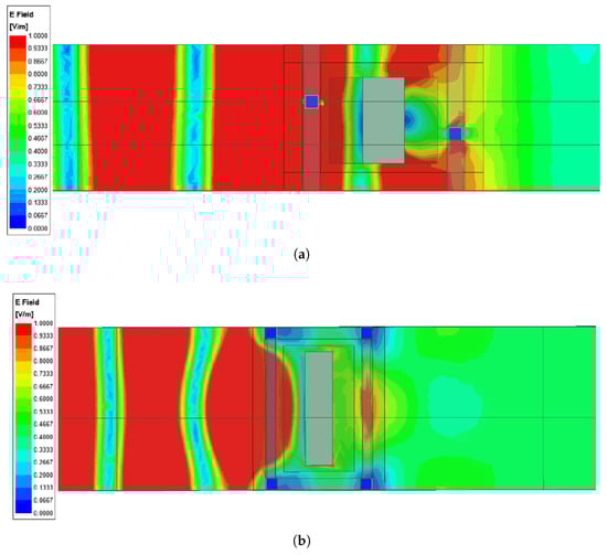 The simulated electric field is plotted in Figure 5a,b for planes cutting the brick in half, considering the side and the top views, respectively. Its value is normalised with respect to the input one (the one obtained without the shield) and clearly shows the presence of standing waves. The vertical plane (Figure 5a, i.e., the side view) indicates that the homogenised capacitor contributes the most to the shielding because the electric field is very low at the interface. From the horizontal plane (Figure 5b, i.e., the top view), it can be seen that also the metallic parts of the supporting structure play a role in the shielding, since they alter the electric field distribution.
