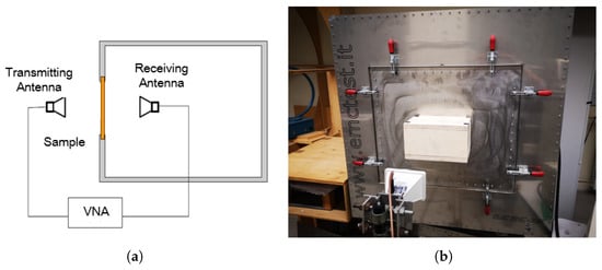 A schematic diagram illustrating the measurement setup for the SE is shown in Figure 6a. The shield can thus be characterised in terms of the “insertion loss” caused by the shield interposed between the TX and RX antennas. The laboratory measurement setup is shown in Figure 6b, where a screened enclosure of dimensions 1 m × 1 m × 1.1 m with an aperture and the brick sample prototype positioned on the aperture is used. The transmitting horn antenna is visible, too. Horn antennas are preferred due to their enhanced directivity.