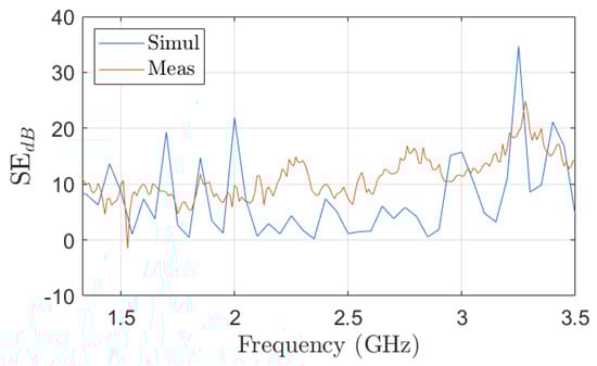 The comparison of the simulated and measured SE is shown in Figure 7. Although the simulations indicate higher values for many frequencies of the frequency range, the trend of the SE as the frequency increases is similar. It has to be noticed that comparison is purely indicative, as the simulation results are obtained exploiting a plane wave in a waveguide, whereas in the measurement twin antennas were used, generating a field configuration which approximates that of a plane wave depending on the frequency and distance. Thus, differences between simulated and measured values can be reasonably expected. In any case, being the predicted SE lower than the measured one, it can be concluded that the simulation provides a conservative estimation of the capability of the energy-buffering system to provide attenuation to electromagnetic fields. In any case, the measured/simulated SE of the energy-buffering system is below 20 dB over the whole frequency range, and thus the shielding provided by the energy-buffering system is very limited.