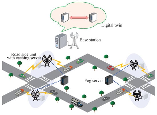We constructed a vehicular network model, as shown in Figure 1. There are U pairs of RSUs in the system, i.e., there are RSUs. The edge storage server connected to each pair of RSUs stores I types of real-time information with different functions and in the form of information blocks. Each type of information is updated at a fixed time interval in the server. Assume that the sizes of information blocks of the same type are equal. The number of vehicles in the system model is V, and each vehicle is simultaneously connected to the nearest pair of RSUs, through which the vehicle obtains the information in the storage server. Let , and denote the set of RSU pairs, the set of vehicles, and the set of information types, respectively. Let be the set of vehicles connected to the u-th pair of RSUs. Each pair of RSUs is connected to a fog server. Therefore, there are a total of U fog servers in the system model. The fog server can be used to control and manage the communication power and information storage allocation of the two connected RSUs. There is a base station in the system, and it is connected to a server, which is used to run the digital twin system. Each fog server in the physical space has a corresponding digital mirror in the digital twin. The fog server maintains contact with its digital mirror through the base station.