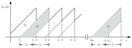 where denotes that the i-th type of information is stored in RSU 1 of the u-th pair of RSUs, and denotes that it is stored in RSU 2. Figure 2 shows the curve of over time, where , , represents the area of the corresponding regions in the figure; , , indicates the moment when the j-th block of information type i is generated in the storage server, and represents the moment when this message block is received by vehicle v. Let and . Assume that vehicles download information at a fixed rate. Since each type of information is updated at fixed time intervals in the server and the message blocks of the same type of information are of equal size, we can deduce