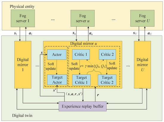 The framework of the power and storage allocation algorithm based on MATD3 is shown in Figure 3. Each fog server’s digital mirror acts as an agent, yielding U agents. They interact with the virtual environment in the digital twin during training to learn optimal strategies. Agent u comprises an actor network (parameterized by ) and two critic networks (parameterized by ), with corresponding target networks . An experience replay buffer stores tuples , and mini-batches are sampled to decorrelate sequential dependencies for training stability.