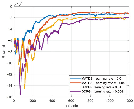 We analyze the convergence performance of the MATD3 and DDPG algorithms in Figure 4. In the simulation scenario, there are 12 RSUs, 120 vehicles, and 60 channels, and the number of information types is 10. The common hype parameters of the two algorithms are set to be the same, and the learning rate of the critic network is 0.01 and 0.005, respectively. It can be seen from the figure that the rewards obtained by the algorithms generally increase with the episode number. When the learning rate of the critic network is 0.01, the MATD3 algorithm converges after about 370 episodes of training, while the DDPG algorithm requires about 650 episodes of training to converge. When the learning rate of the critic network is 0.005, the MATD3 algorithm converges after about 600 episodes of training, while the DDPG algorithm requires about 750 episodes of training to converge. Thus, it can be obtained that the MATD3 algorithm converges faster. The figure also shows that the convergence curve of the MATD3 algorithm has less fluctuation and achieves a higher final reward.