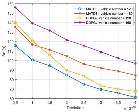 Figure 5 illustrates the trend of the total AoI in the system, which is obtained by the MATD3 and DDPG algorithms and in relation to an increasing channel gain prediction deviation of the digital twin. In this simulation, each vehicle occupies a distinct channel, and the communication between vehicles and RSUs is free from interference by other communication links. It can be seen from the figure that the total AoI decreases with increasing deviation. This is because in (13) in the absence of interference, and the value of (13) changes as increases. Consequently, the download rate of the vehicle increases, which reduces both the information download time and the queuing time for information transmission, thereby decreasing the AoI. In addition, Figure 5 demonstrates that the proposed MATD3 algorithm achieves superior AoI performance compared to the DDPG algorithm in this scenario. Furthermore, as the number of vehicles increases, the performance gap between the two algorithms widens. The MATD3 algorithm maintains stable AoI performance, while the DDPG algorithm exhibits a more significant degradation in AoI.