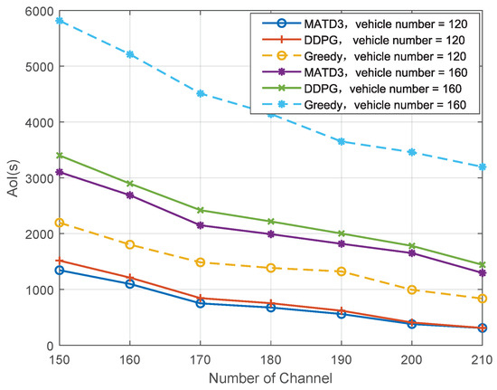 The total AoI of the system achieved by the MATD3 algorithm and that by the DDPG and greedy algorithms are shown in Figure 6, in relation to different vehicle numbers versus the number of system channels. For the greedy algorithm, the RSUs select the maximal transmission power, while a random strategy is adopted for information cache allocation. It is observed that the total AoI decreases as the number of system channels increases.