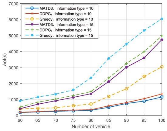 Both Figure 6 and Figure 7 demonstrate that the MATD3 algorithm exhibits better AoI performance than the DDPG and greedy algorithms. Since the greedy algorithm not only selects the total maximal transmission power of RSUs, increasing communication interference, but also uses random information storage allocation, a worse storage location is obtained for certain information types. This reduces the information transmission rate and increases both transmission delay and queuing waiting time. In contrast, the MATD3 algorithm obtains transmission power and information cache allocation through training so as to reduce the queuing time and transmission delay.