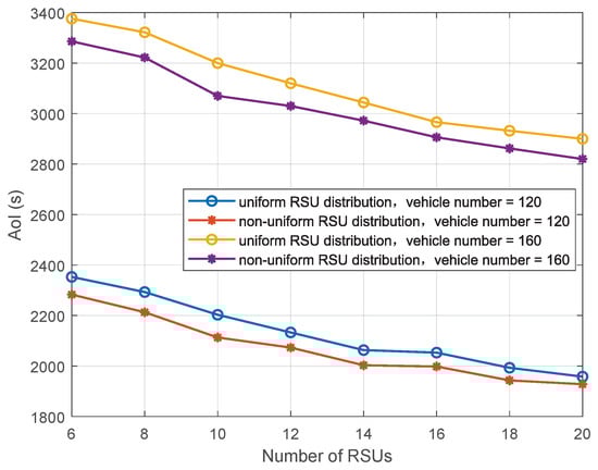 We compare AoI performance under the uniform and non-uniform deployment of RSUs in Figure 8. It can be seen that the AoI is smaller under non-uniform RSU distribution than uniform RSU distribution. This is because the non-uniform configuration adjusts the distribution interval according to the vehicle density so as to reduce the AoI of the vehicles in a high-density area. Moreover, the AoI decreases with the RSU number because the distance from the vehicle to the RSU becomes smaller with increasing RSU configuration.