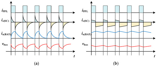where denote the high-pass filter’s cutoff angular frequency. Under pulsed load conditions, the operational logic allocates high-frequency current components to the SC unit, while the battery unit absorbs the low-frequency residual. The resultant battery converter current ripple after the initial pulse excitation is analytically modeled as: