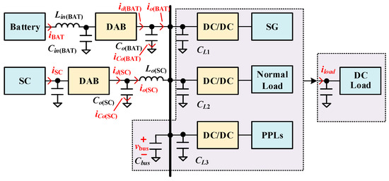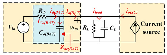 can be approximated by in Equation (20), exhibiting the same low-pass characteristics as a voltage source consisting of and . The current transfer ratios and are defined for the relationships between and , and between and , respectively. These transfer functions analytically decompose the load current contributions from the SC and battery converters, respectively. The equivalent parallel output impedance governs the DC bus voltage transient response under load current disturbances. According to Figure 6, the following expression can be derived: