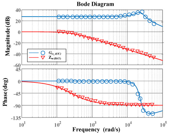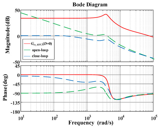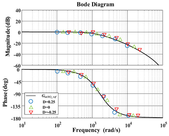Figure 9 gives the verification of the bode diagram for , where the discrete symbols are the frequency sweep results with different D and the theoretical analysis results represented by a straight line. As it can be seen from the figure, the bode diagram of matches well with the results when D = 0.25, D = 0, D = −0.25, which indicates that the tracking performance of SC converters is consistent even in different operating states.