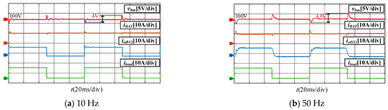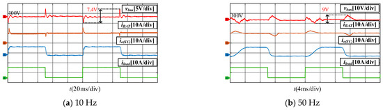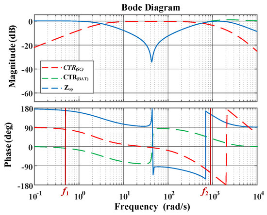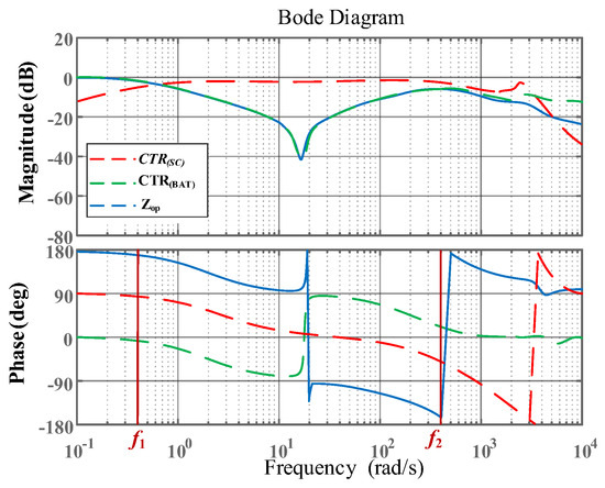Figure 7 presents the Bode plots of , , and . The frequency spectrum is segmented into three bands, with threshold frequencies f1 and f2 are 0.5 Hz and 900 Hz. In the low-frequency region (below f1), the gain of is lower than that of , indicating that the battery converter primarily supplies the low-frequency load current. Between f1 and f2, || significantly exceeds ||, demonstrating that the SC converter predominantly handles the AC power component in this range. Beyond f2, the magnitude of || declines, as the SC converter’s ability to follow high-frequency AC currents diminishes. Therefore, increasing f2 is necessary to enhance high-frequency tracking performance. Moreover, the DC gain of equals 20lg , confirming that the battery converter’s droop characteristic remains unaffected by the integration of the SC unit.