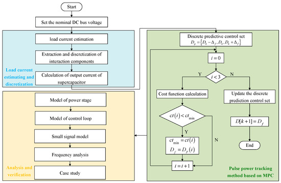 The research steps can be concluded as Figure 16. This paper introduces a power allocation and tracking method for a HESS with pulsed loads, aiming to improve the stability of the bus voltage. To verification the research, the pulse power tracking based on MPC for SC converter is presented by cost function. Then the frequency–domain analysis for the HESS is carried out based on the small signal model of the system which is compared with PI controller. Finally, the time-domain analysis including HESS system with single SC converter and battery converter as well as HESS system with multiple SC converters is given to indicate the effectiveness of the proposed method on solving the voltage fluctuation.