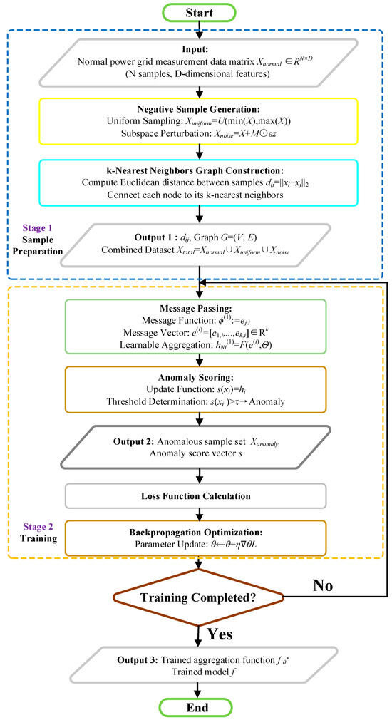 Current FDIA detection methods include model-driven and data-driven approaches. Model-driven methods build detection mechanisms based on physical models (e.g., state estimation equations, topology). For example, ref. [1] proposed an optimal measurement equipment scheduling (OMES) framework, calculating anomaly scores using grid physical constraints for attack identification. This approach predicts normal states theoretically, triggering alarms when deviations exceed thresholds. Its advantages include strong interpretability and unsupervised operation (no labeled data required). However, it heavily depends on grid physical models. Data-driven methods, by contrast, rely less on physical models and instead use machine learning (ML) or deep learning (DL) to extract patterns from historical data. Their core capability lies in data representation and nonlinear relationship mining. Existing data-driven FDIA detection methods include graph-based approaches, probabilistic methods, linear models, distance-based algorithms, outlier ensembles, and deep learning techniques.