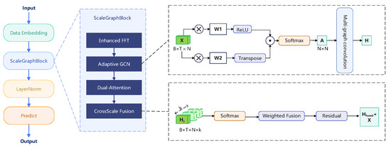 Our proposed method is composed of four main modules: enhanced frequency domain modeling, an adaptive graph convolution module, frequency–time domain dual attention, and a cross-scale fusion mechanism. The overall architecture is illustrated in Figure 1.
