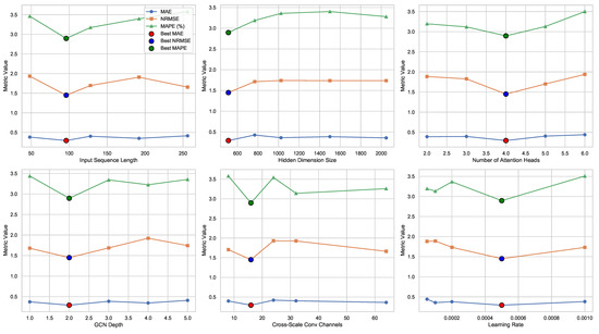 As shown in Figure 2, each hyperparameter exhibits a distinct influence on model performance, closely reflecting its functional role within the architecture. The input sequence length serves as a temporal sampling window, where a value of 96 effectively captures frequency domain features and global temporal dependencies while avoiding excessive noise and computational overhead from longer sequences. The hidden dimension size determines the model’s representational capacity; an intermediate setting (512) enhances the attention mechanism’s effectiveness without incurring unnecessary computational cost or diminishing returns. The number of attention heads influences the granularity of spatio-temporal dependency modeling, with four heads achieving optimal performance and too few or too many leading to slight degradation. The GCN depth balances the ability to learn spatial dependencies and the risk of overfitting, with two layers yielding the best results. The number of cross-scale convolution channels affects the capacity to capture local spatio-temporal features, where a moderate increase (16 channels) improves performance, but further growth increases resource demands significantly. Finally, the learning rate plays a critical role in training stability and convergence speed; a value of 5 × 10−4 offers a balanced trade-off between fast convergence and avoiding instability or overfitting. Considering prediction accuracy, computational resources, and training time, we select the following optimal hyperparameter configuration: an input sequence length of 96, a hidden dimension size of 512, 4 attention heads, a GCN depth of 2, 16 cross-scale convolution channels, and a learning rate of 5 × 10−4.
