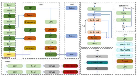 The network architecture of YOLOv8 consists of three parts: backbone, neck, and head. As an improved version of YOLOv5, YOLOv8 adopts the gradient separation concept in both the backbone and neck structures and also utilizes the PAN-FPN structure [