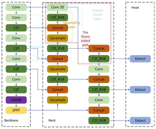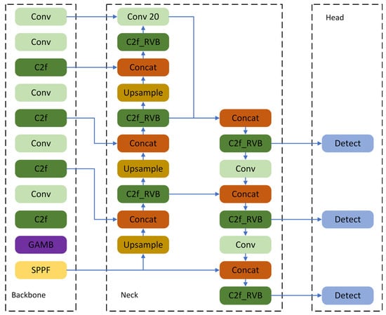 Therefore, in this paper, we replace the two standard convolution blocks with residual connections in the YOLOv8n C2f module with the RepViT Block module. Then, we fuse them into a new lightweight module, C2f_RVB. We use the C2f_RVB module to replace the C2f module in the YOLOv8n’s neck. The C2f_RVB module can maintain the ability to capture detailed information. It also optimizes multi-scale feature extraction and suppresses background noise. This allows the network to achieve higher detection accuracy in complex scenarios. Meanwhile, with a more efficient feature processing mechanism, it reduces the computational burden. It balances performance and resource utilization effectively, making the network better suited for deployment on resource-restricted platforms.