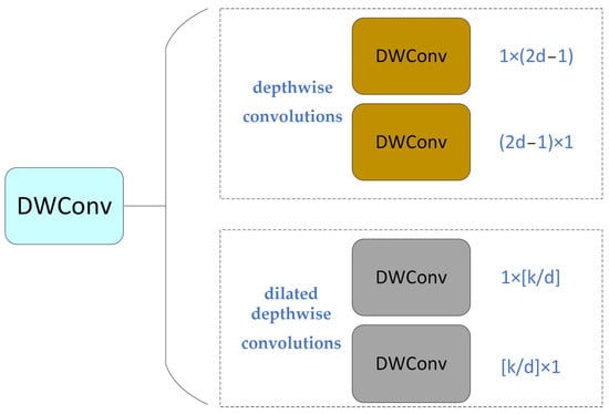 31]. Specifically, this paper replaces the two 7 × 7 standard convolution layers in the original GAM attention mechanism with two DWConv groups. Each group consists of two depthwise convolutions, one BatchNorm layer, one ReLU layer, and two dilated depthwise convolutions. The structure is presented in
