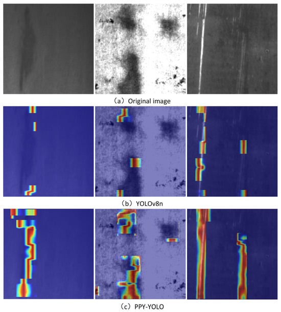 Heatmap visualization outcomes. (a) Presents the original image, (b) shows the detection performance of the baseline model YOLOv8n, and (c) demonstrates the detection performance of the model proposed in this paper.