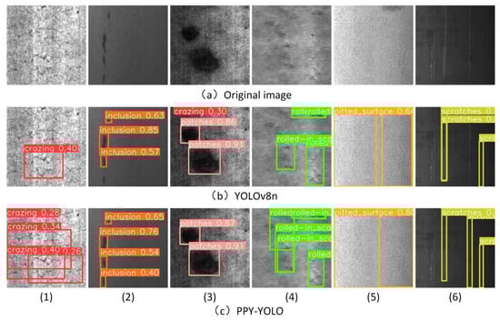 Detection performance. (a) Represents the original input image. (b) Shows the detection results of the baseline YOLOv8n model. (c) Presents the detection results of the model proposed in this paper. Sub-graphs (1–6), respectively, correspond to instance images of different defect classes randomly chosen from the test set.