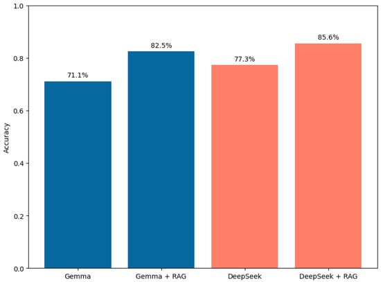 This study employed two models, DeepSeek-r1:14b and Gemma3:12b, each evaluated under two conditions: without RAG (native LLM) and with RAG. The corresponding response accuracy rates are presented in Figure 2. The results reveal that both models exhibited notable performance improvements when integrated with RAG. Specifically, the accuracy of the Gemma3:12b model increased from 71.1% to 82.5%, while that of the DeepSeek-r1:14b model improved from 77.3% to 85.6%. These findings suggest that the incorporation of RAG enhances the ability to retrieve relevant knowledge and generate accurate responses, thus improving overall answer accuracy.