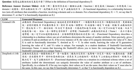 This study develops a CE-GAITA, which offers multiple combinations of LLMs and embedding models to accommodate various application scenarios. Users can select the most suitable model according to their specific needs. Additionally, the system includes an interactive Q&A interface that allows users to input questions. Through the integration of RAG technology, the system retrieves relevant data and generates accurate responses accordingly. A file upload function is also provided that enables users to upload classroom materials in PDF format. This ensures that the system’s AI-generated responses are aligned with the actual course content. Figure 3 shows an example of how the system responds to the teaching question, showing the results with LLM = Gemma3:12b and DeepSeek-r1:14b and the embedded model = Hugging Face all-mpnet-base-v2.