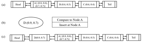 Bidirectional chain structure for feature influence ranking: (a) initial chain with three nodes; (b) insertion of a new node (0.9, 0.7); (c) updated chain after insertion.