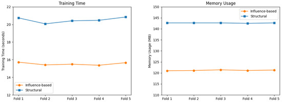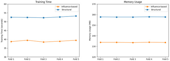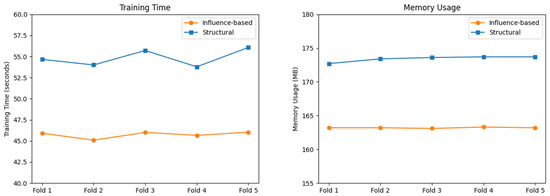 With Table 8 and Figure 4, it is easy to see that the models optimized using the input influence-based method have less training and lower memory usage compared to those models compressed via structural compression method. The results for Folds 1–5 within each dataset are closely aligned, indicating that the proposed method maintains stable performance across different random data splits. The small variations observed reflect the consistency of the compression algorithm, rather than insensitivity to changes in the input.