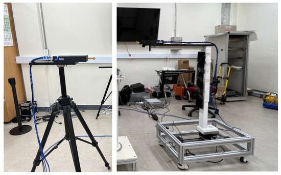 Channel measurements were conducted in the 275–295 GHz frequency band using a Keysight N5227B vector network analyzer (VNA) combined with VDI’s WR 3.4 frequency extenders. The measurement system supports a total bandwidth of 20 GHz with a frequency step size of 16.67 MHz, resulting in 1201 frequency points per sweep. The intermediate frequency (IF) filter bandwidth was set to 10 kHz. This configuration provides a time-domain resolution of 0.05 ns and a maximum delay range of 30 ns. Figure 1 illustrates the overall measurement setup, including the transmitter and receiver devices used in the experiment. The VNA and frequency extender modules are mounted on height-adjustable frames to allow flexible antenna positioning. The transmitter can be manually rotated both horizontally and vertically, while the receiver is placed on a motorized linear stage for precise spatial scanning. The transmitter system consists of a horizontally fixed VNA and frequency extender mounted on a mechanical structure that allows vertical height adjustment and manual rotation in both horizontal (0° to 180°) and vertical (−70° to 0° down-tilt) directions. The transmitting antenna can be positioned at heights between 0.8 m and 2.0 m. The receiver system is configured similarly, with a VNA and extender installed on a vertically adjustable mount. The receiver is mounted on a motorized linear stage with a movement range of 1 m and a resolution of 0.5 mm to 1 mm. Additionally, a vertical translation device (range: 800 mm to 1300 mm) and a 360° azimuth rotator with 1° resolution are controlled by custom software to ensure precise positioning. Horn antennas with three different beamwidths—10° (22 dBi gain), 30° (14 dBi), and 60° (7 dBi)—were used for both transmission and reception. All antennas are linearly polarized in the vertical direction and employed in matched pairs (i.e., the same beamwidth at both Tx and Rx). The key measurement parameters are summarized in Table 1.