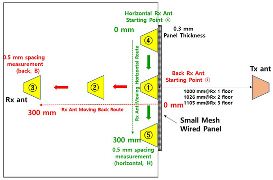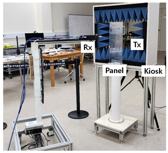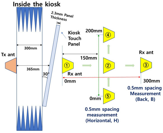 Scenario 1 (Figure 3): The transmitter, receiver, and kiosk panel are arranged in parallel. The transmitter is fixed, while the receiver moves along two predefined paths: